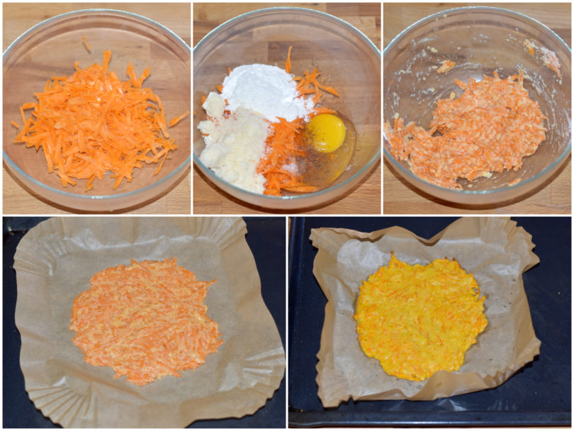 Mondate le carote e grattugiatele alla julienne con una grattugia a fori larghi, quindi unitele in una ciotola con farina, grana, uovo, un filo d'olio, sale e pepe.