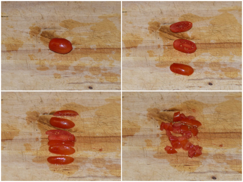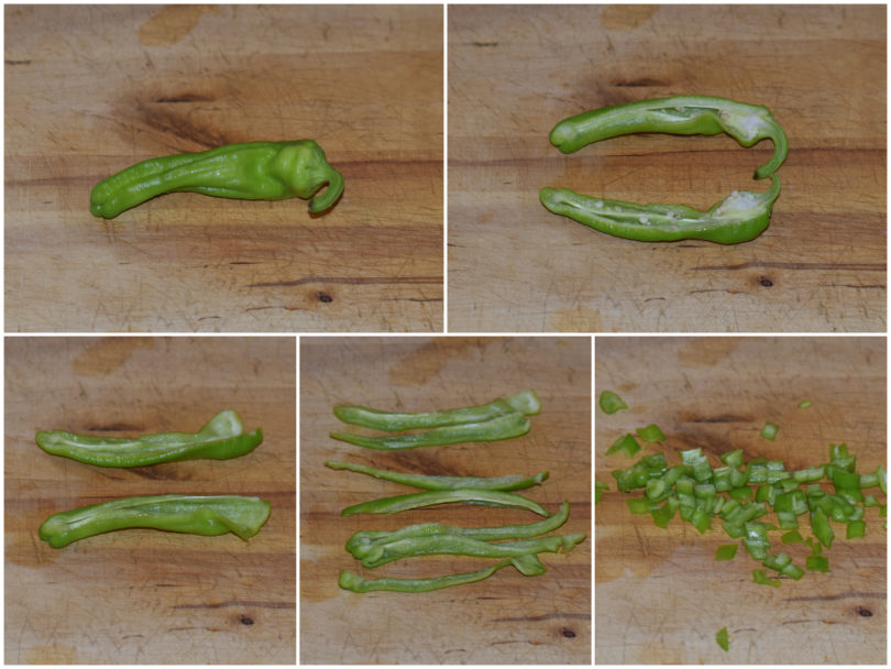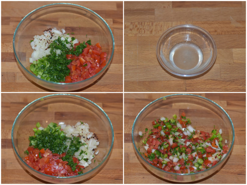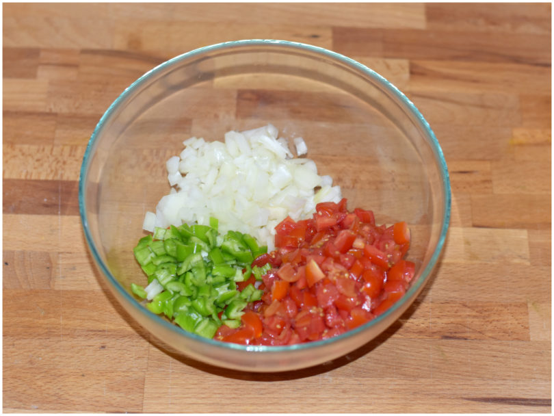 Innanzitutto lavate bene le verdure (pomodori, peperoncini e cipolla), mondatele e tagliatele a cubetti i.