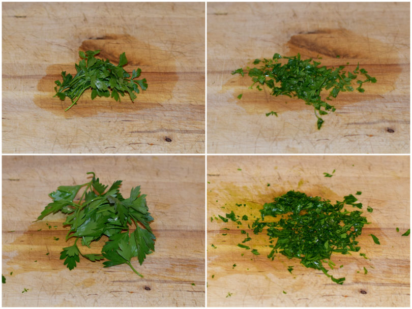Mondate e tritate coriandolo e prezzemolo e uniteli alle verdure.