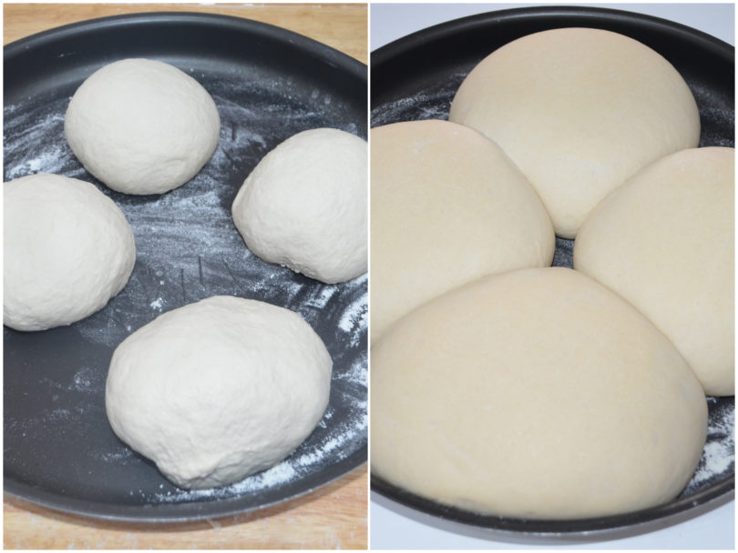 Dividete l'impasto in 4 parti uguali, disponetele su una superficie leggermente infarinata e lasciate lievitare per almeno 2 ore in un posto chiuso e al riparo da correnti.