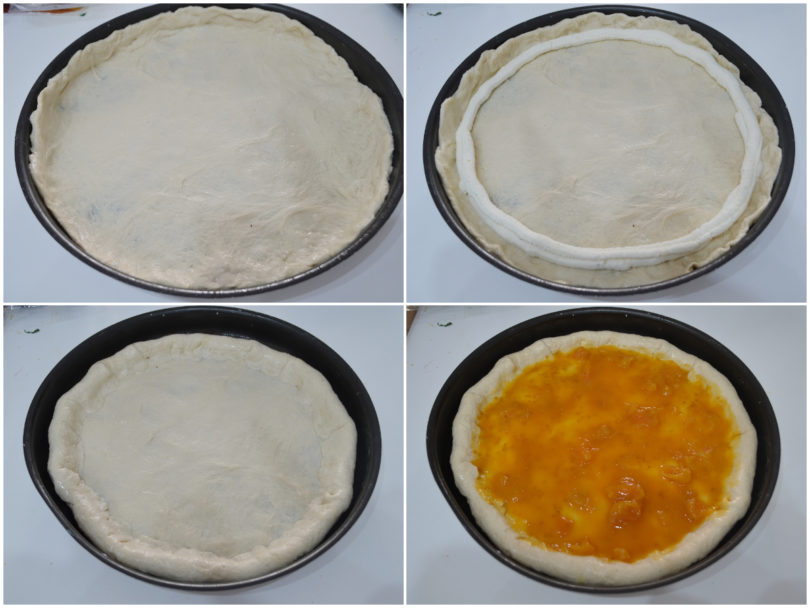 Disponete la farcitura lungo i bordi del cerchio di pasta per pizza (se vi è più comodo potete usare una sac à poche), quindi ripiegate l'impasto sopra la farcitura per creare il cornicione imbottito. Sigillate bene.
