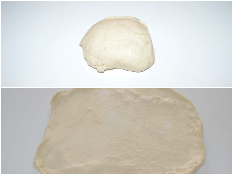 Una volta lievitato l'impasto, riprendete i panetti, sgonfiateli con le mai infarinate e stendeteli a formare una base per pizza un po' più grande del normale.