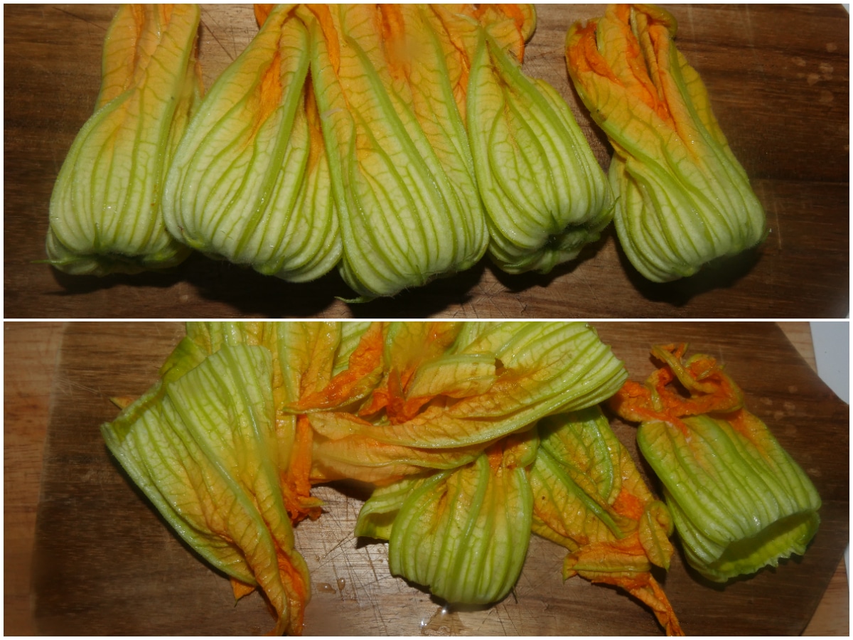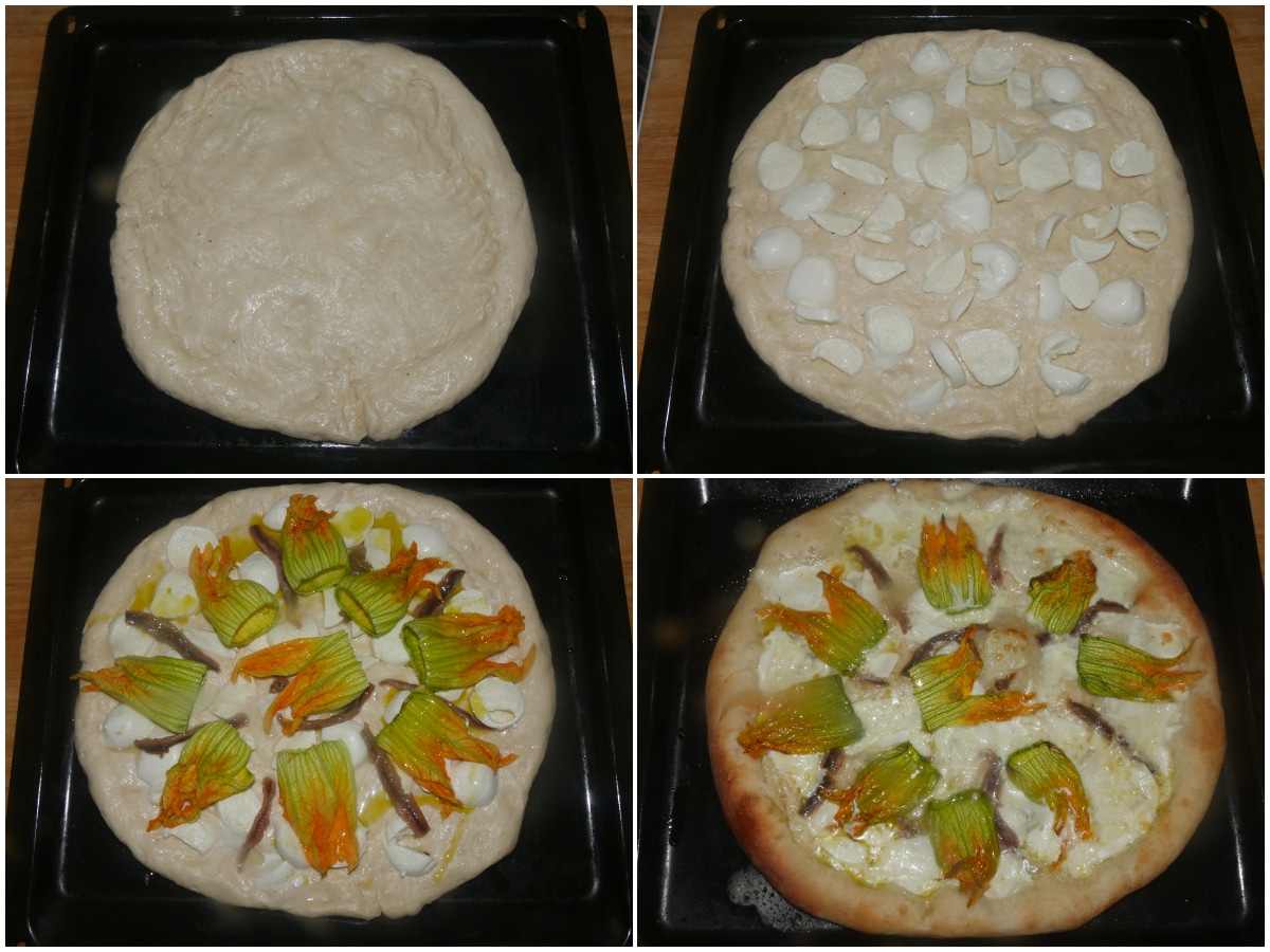 La pizza con fiori di zucca ricorda un po' il mio tortino con fiori di zucca, e in effetti la differenza sostanziale sta nell'impasto, che non è una pastella ma bensì un vero e proprio impasto per pizze. In realtà si tratta infatti di una pizza piuttosto in voga nel periodo estivo anche nelle pizzerie, almeno qui da noi. A me piace molto, voi l'avete mai provata?