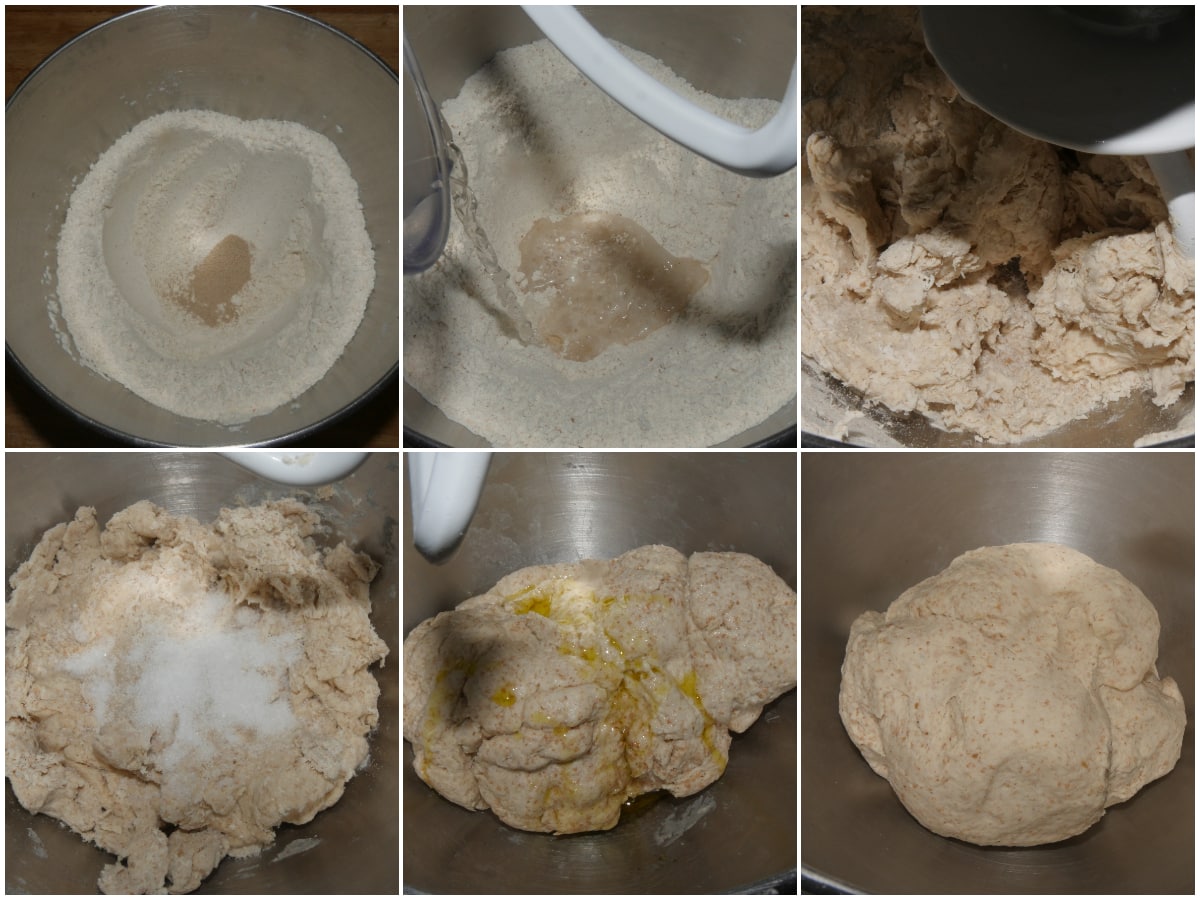 Mettete in una ciotola le farine, lo zucchero e il lievito, aggiungete l'acqua e amalgamate, quindi incorporate anche sale e olio e lavorate per almeno 10 minuti.