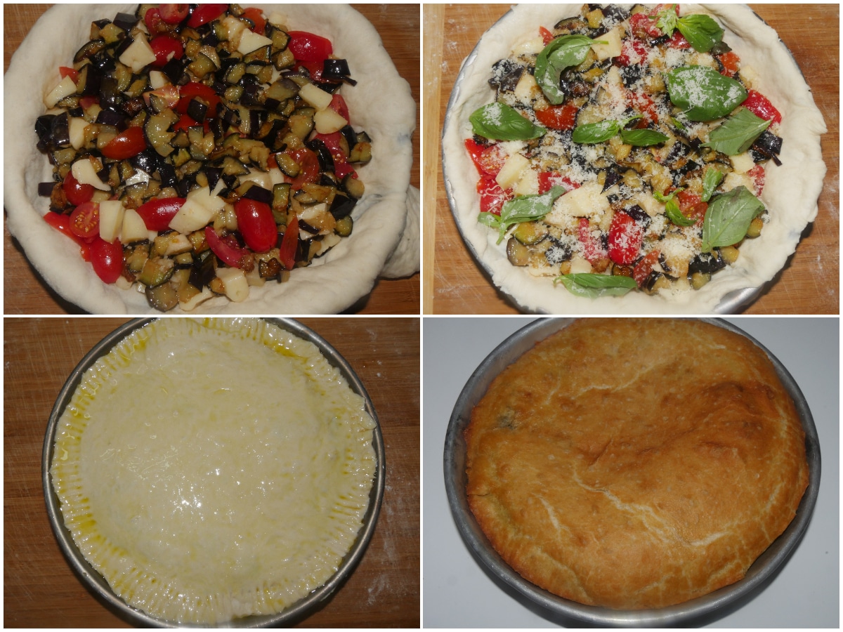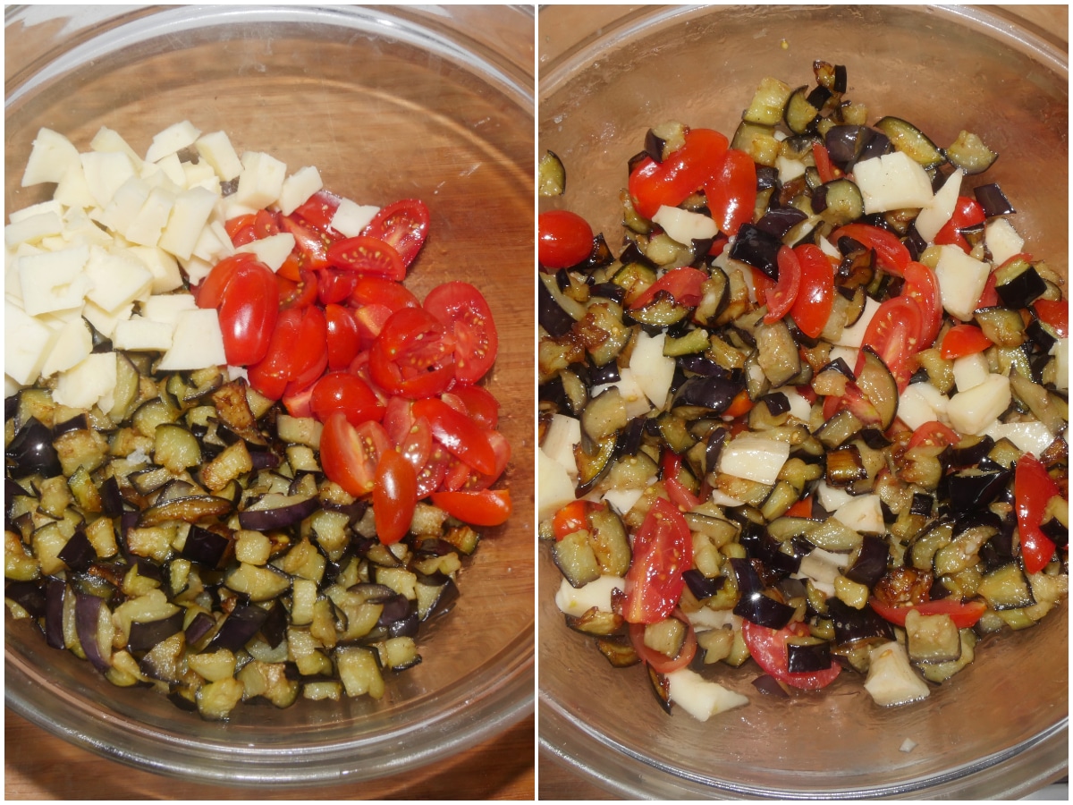 L’ho preparata con pelati sgocciolati e spezzati, melanzane grigliate del giorno prima sott’olio tagliate a cubetti, formaggio tipo Galbanino, e parmigiano. Una delizia! La prossima volta devo mettere meno olio perché sono andata un po’ a occhio con tutti gli ingredienti.