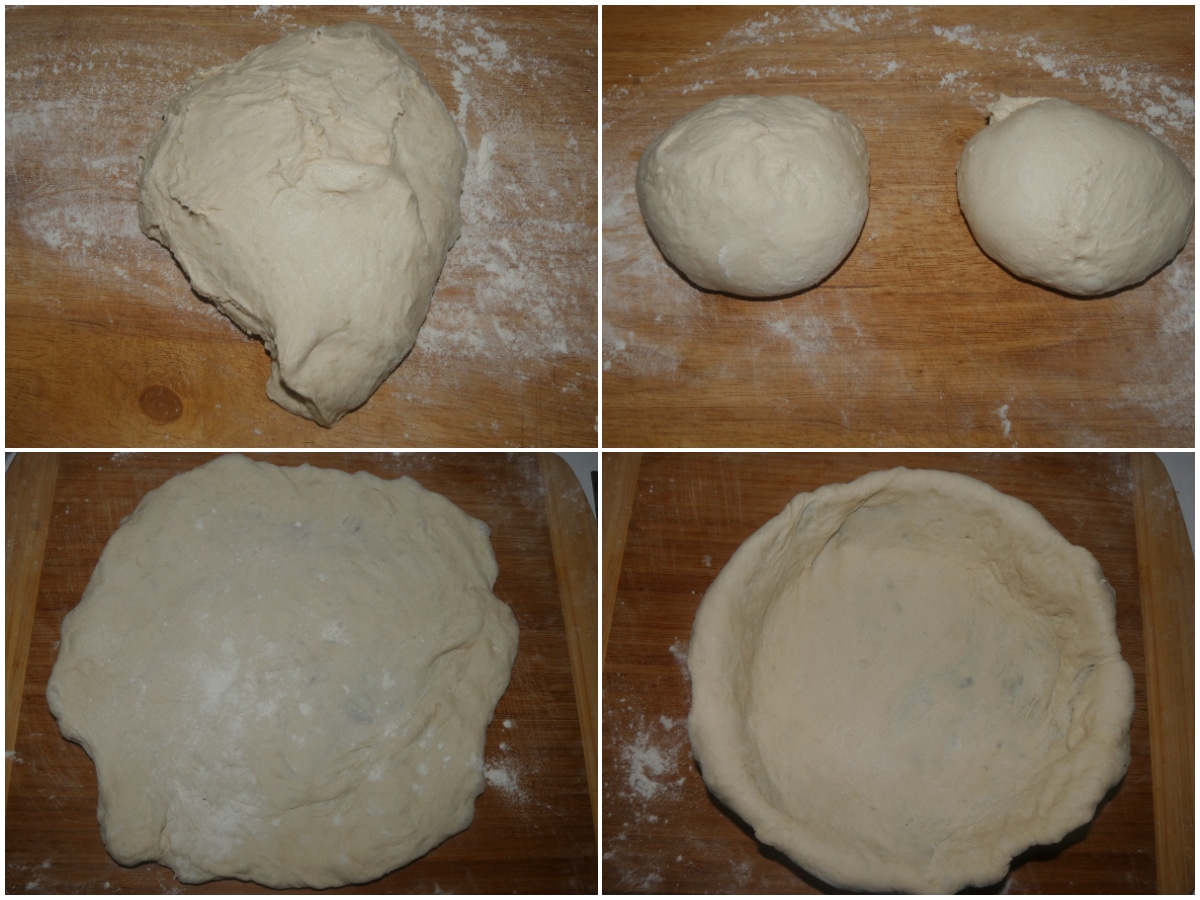 Dividere la pasta per pizze in 2 parti e stendere 2 dischi (1 più grande e 1 più piccolo).