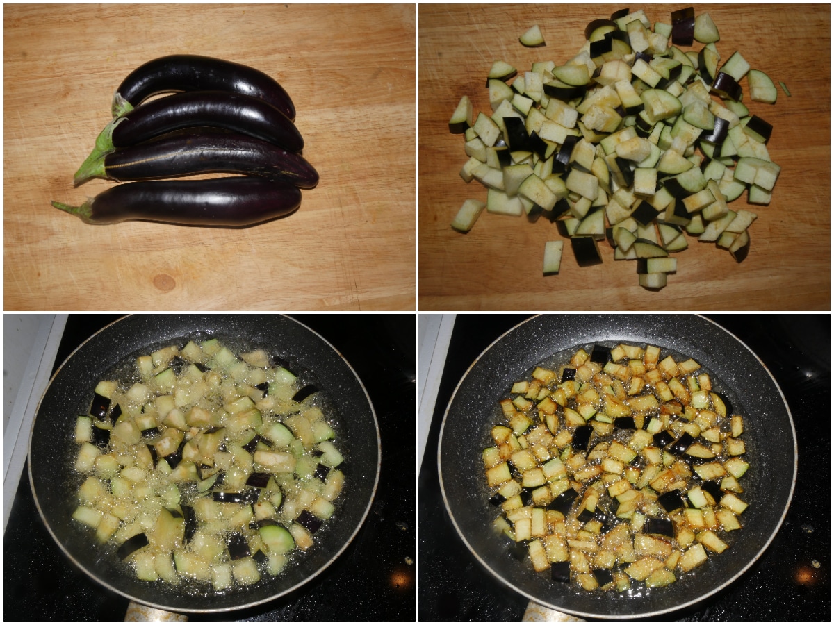 Lavate e spuntate le melanzane e tagliarle a dadini, poi friggetele in padella fino a che saranno dorate, poi e sgocciolarle su carta assorbente da cucina.