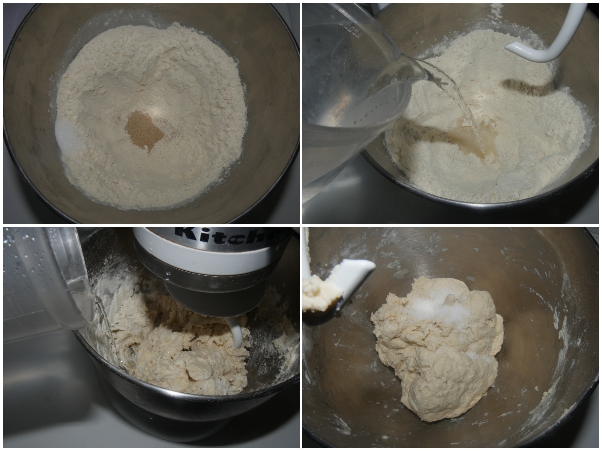 Mettete la farina in una ciotola con all'interno lievito e zucchero e mescolare. Poi fate un buco al centro e versare l'acqua a temperatura ambiente man mano che viene assorbita. In ultimo aggiungere sale e olio e continuare ad impastare fino ad ottenere un impasto liscio ed omogeneo, ci vorranno circa 15 minuti.