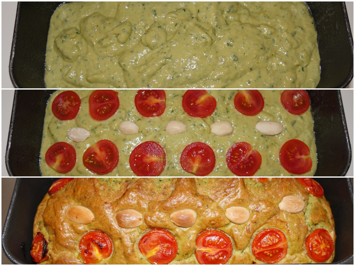 Versate il composto nello stampo imburrato e infarinato, quindi decorate con pomodorini e mandorle. Cuocete quindi in forno già caldo a 180° per circa 30 minuti.