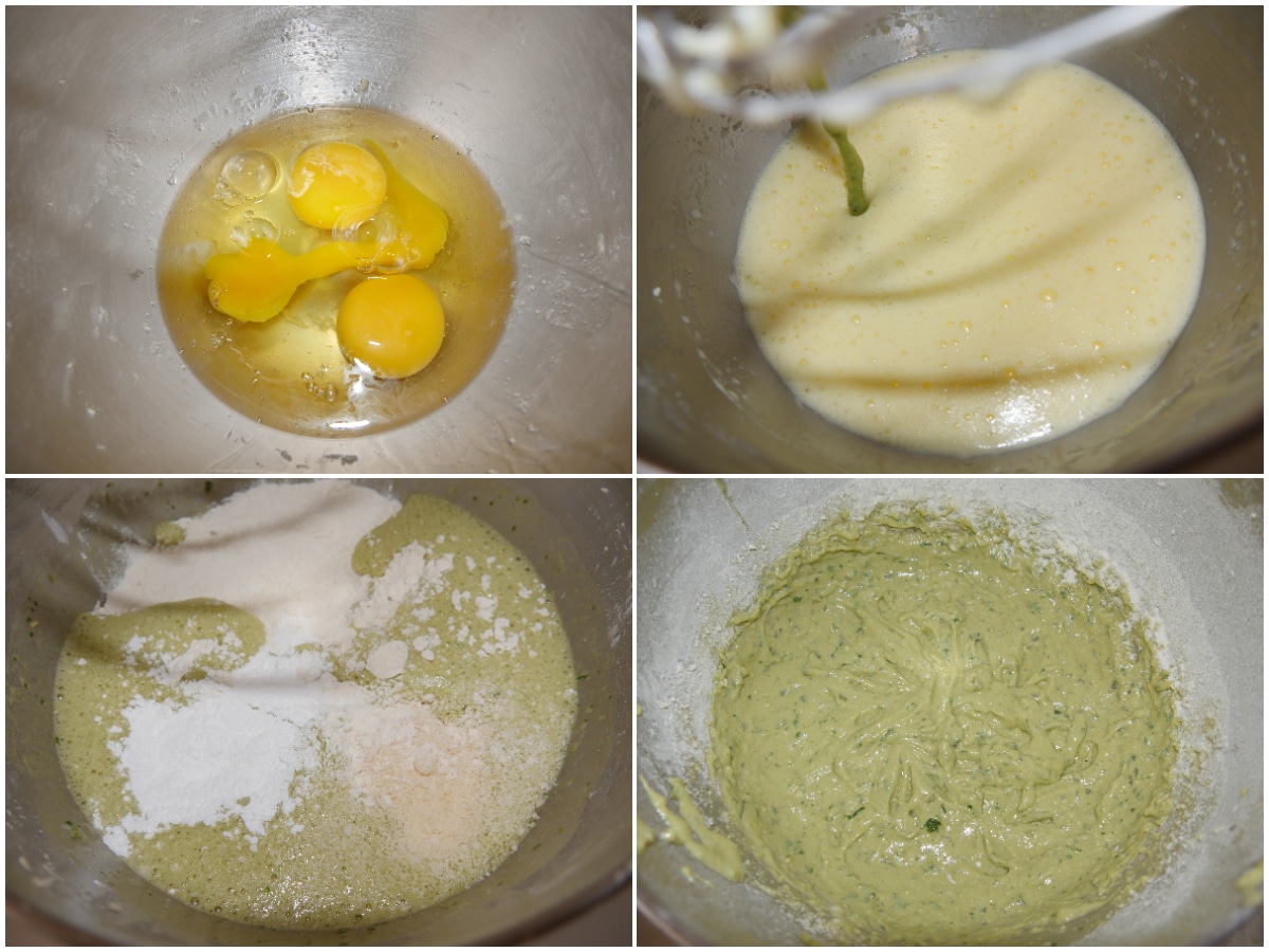 Montate le uova fino ad ottenere un composto chiaro e spumoso, incorporate il basilico frullato, poi unite anche farina e lievito setacciati, insieme con il parmigiano.