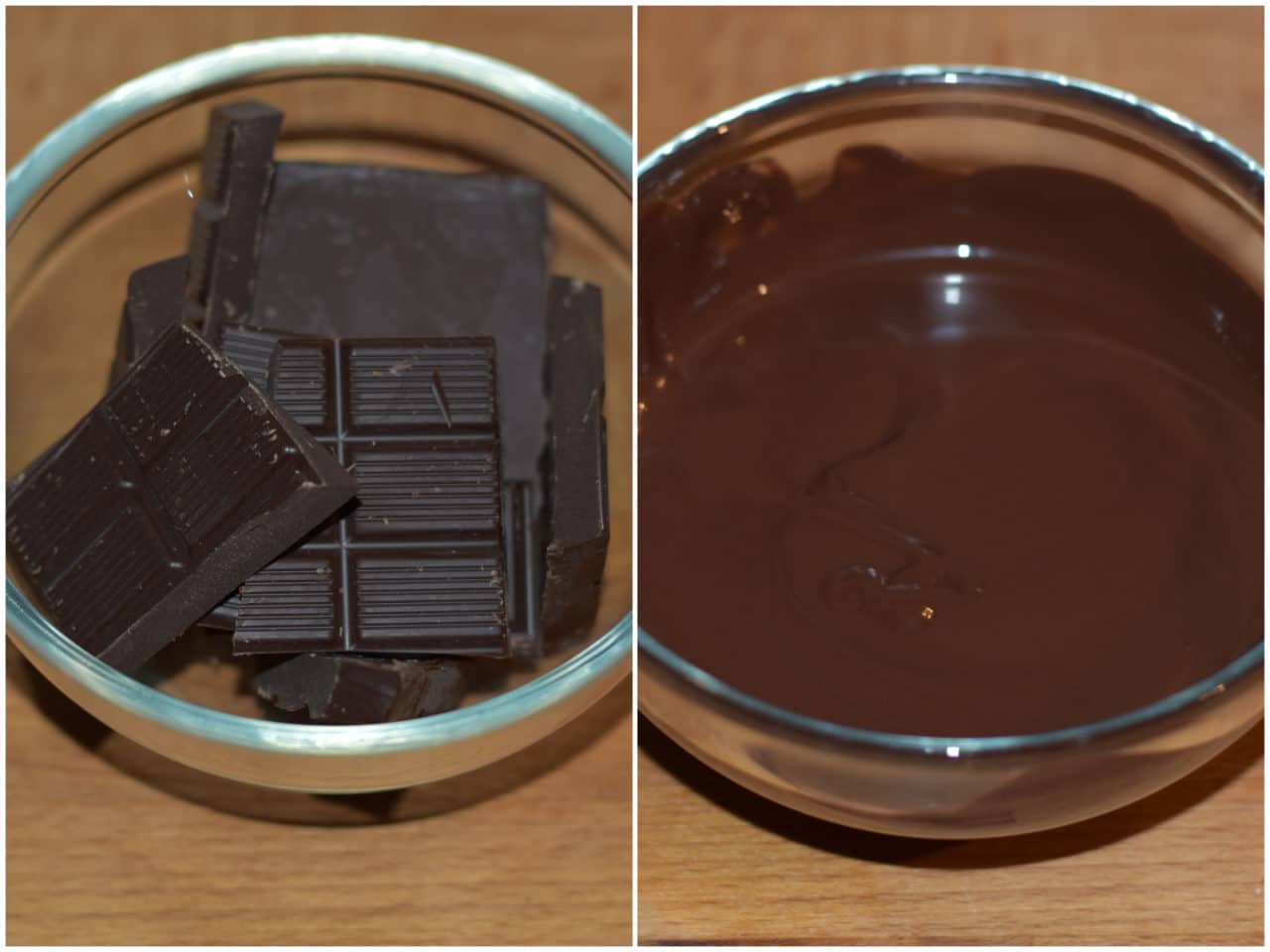 Spezzettate il cioccolato e scioglietelo in microonde o a bagnomaria, quindi lasciatelo intiepidire.