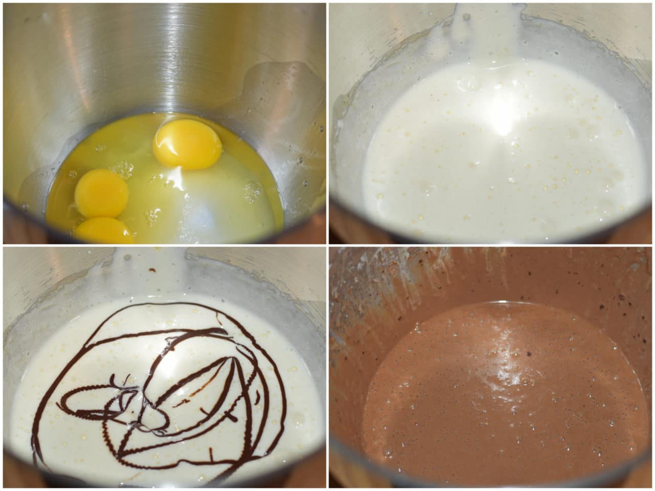 Nel frattempo montate le uova con lo zucchero per almeno 5-10 minuti, fino a renderle chiare e spumose, poi incorporate il cioccolato fuso a filo.