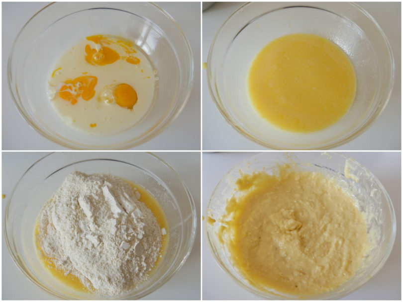 A parte, unite farina, sale, pepe, lievito e i formaggi, quindi incorporate gli ingredienti secchi in quelli liquidi.