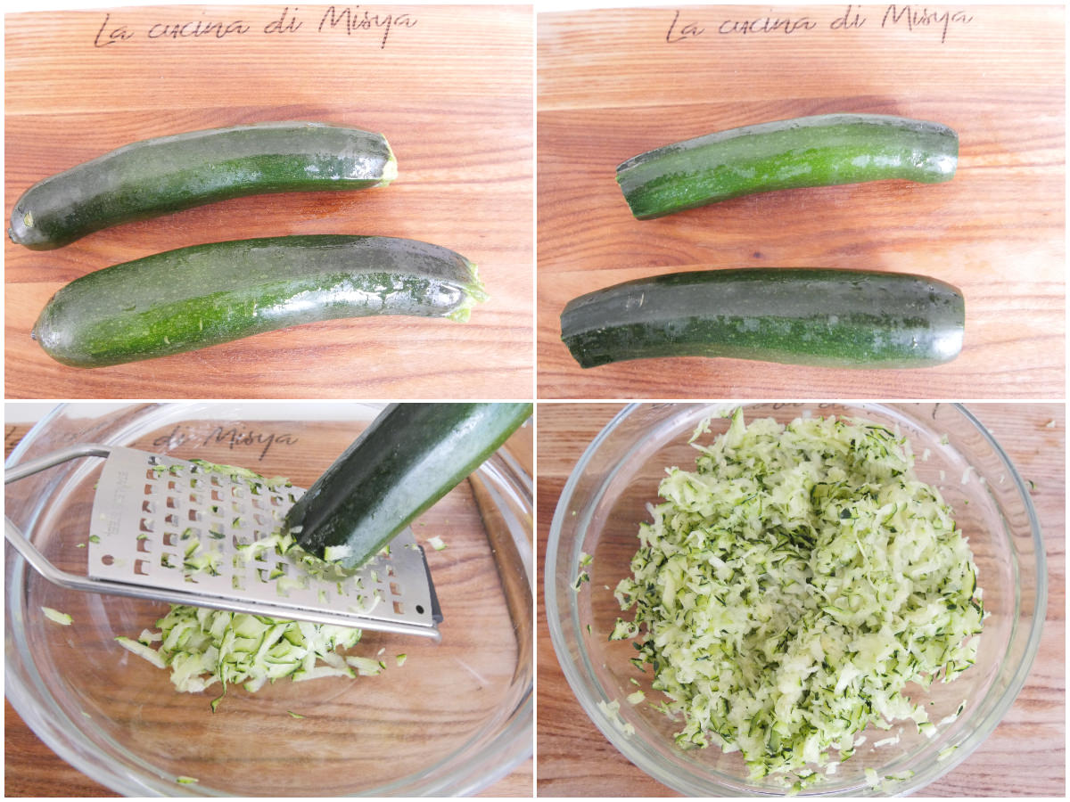 Innanzitutto lavate le zucchine, mondatele e grattugiatele alla julienne con una grattugia a fori larghi.