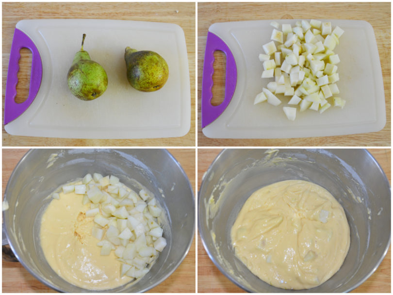 Sbucciate le pere e tagliatele a cubetti. Aggiungetele all’impasto e mescolate per farle bene incorporare.
