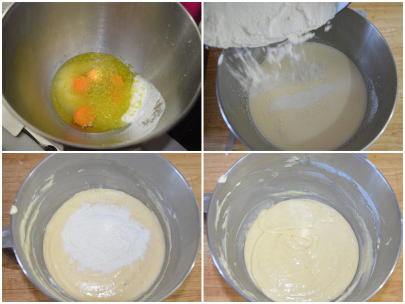 Aggiungete l’olio, il succo di limone e l' acqua. Poi unite la farina ed il lievito e lavorate fino ad ottenere un impasto omogeneo.