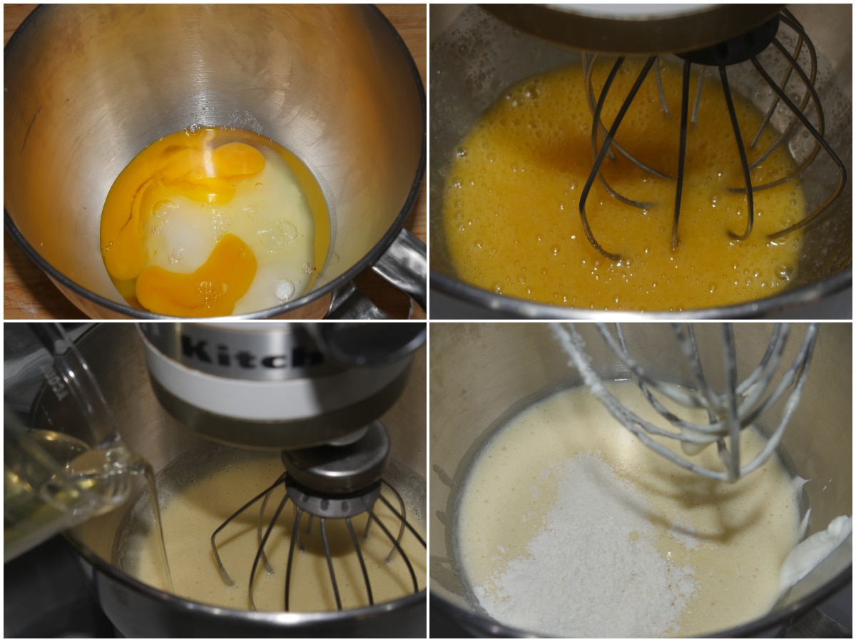 Innanzitutto sbattete a lungo le uova con lo zucchero, quindi incorporate prima l'olio e infine lo yogurt, le farine e il lievito setacciato.