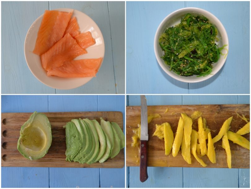 Preparate gli altri ingredienti e pulite l'avocado e il mango e tagliateli a fettine.