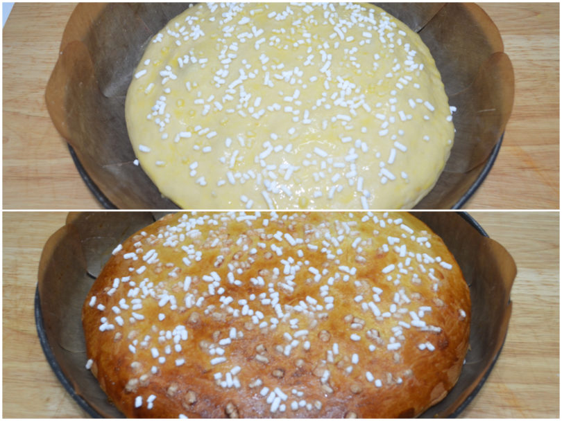 Spennellate la superficie con il tuorlo sbattuto e cospargete con la granella di zucchero, quindi cuocete per circa 25-30 minuti in forno statico preriscaldato a 180°C.