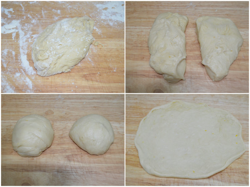 Riprendete il panetto, sgonfiatelo con le mani, quindi dividetelo a metà e stendetelo in due cerchi sottili.