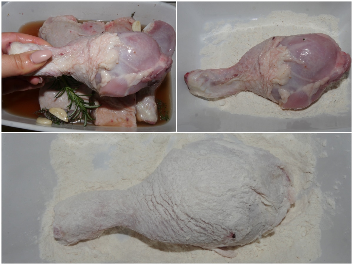 Riprendete il pollo, prendetene 1 pezzo per volta scolandolo dalla marinata e infarinatelo per bene.