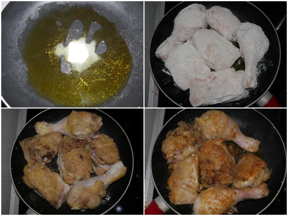 Fate scaldare burro e olio in una casseruola e rosolate i pezzi di pollo, facendoli dorare in maniera uniforme.
