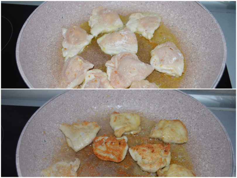 Scaldate un po' d'olio in una padella antiaderente, quindi iniziate la cottura del pollo, cercando di non far riaprire le fettine.