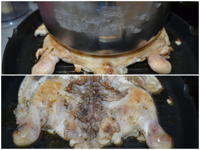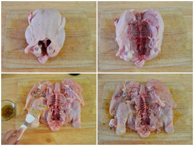 Eliminate le zampe e il collo del pollo. Tagliatelo a metà dal lato del petto e appiattitelo per bene schiacciandolo sul piano di lavoro.
