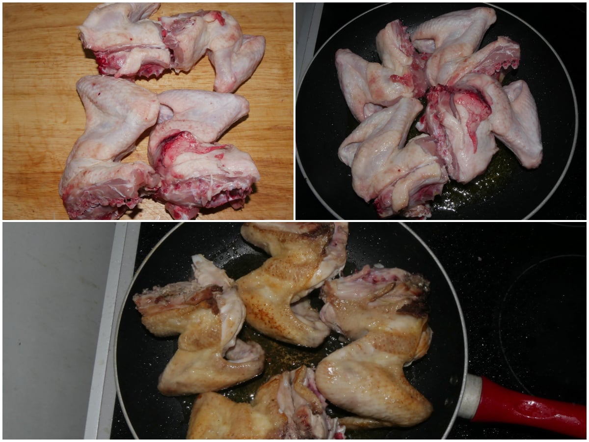 Mettete il pollo, già a pezzi, in una casseruola antiaderente e lasciatelo rosolare a fiamma viva per qualche minuto insieme con un po' di olio.