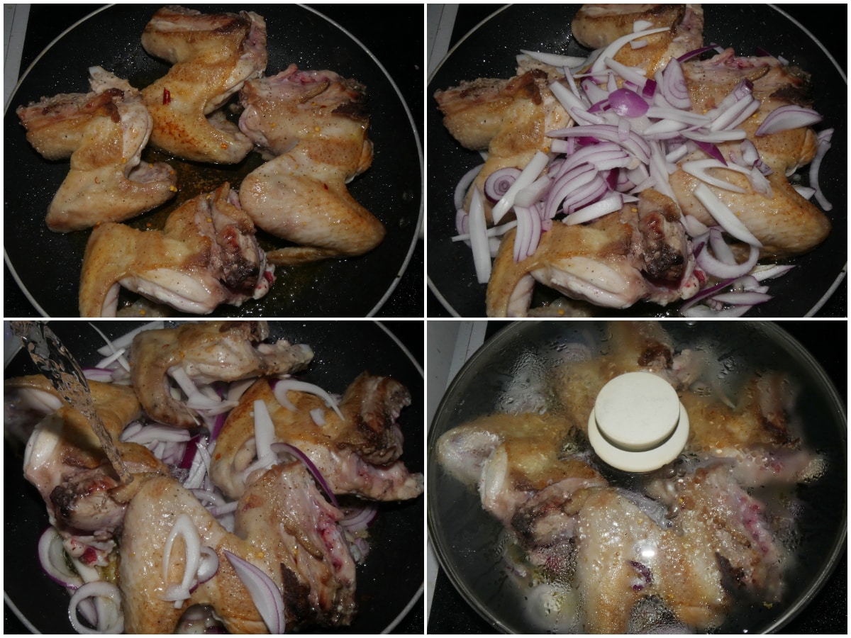 Unite le cipolle al pollo, condite con sale e peperoncino, aggiungete 1 cucchiaio di acqua, coprite con coperchio e lasciate stufare per 20 minuti a fiamma bassa.