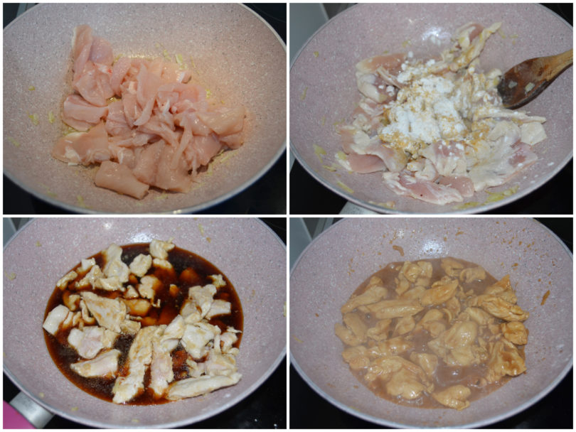 Aggiungete il pollo nella padella, fatelo scottare, quindi unite il mix di maizena e zenzero e mescolate delicatamente.