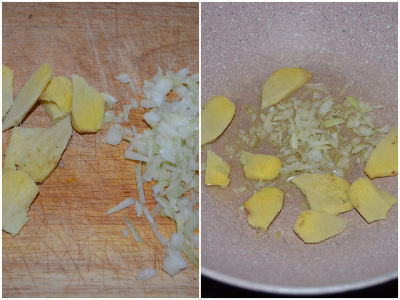 Soffriggeteli insieme a un po' d'olio in una padella antiaderente. Una volta ammorbidito, eliminate lo zenzero.