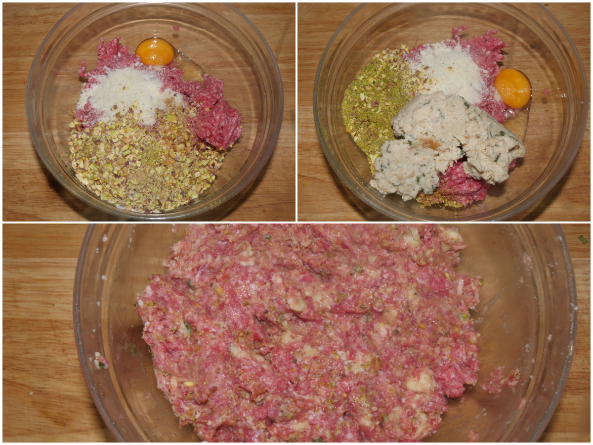 Unite in una ciotola carne, uovo, parmigiano, 80 gr di granella di pistacchi, pane e un pizzico di sale e amalgamate.