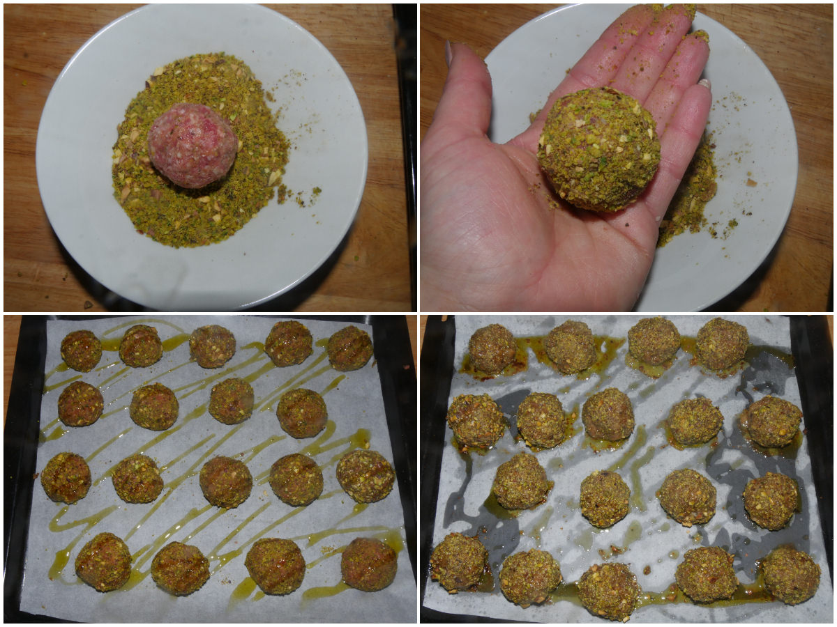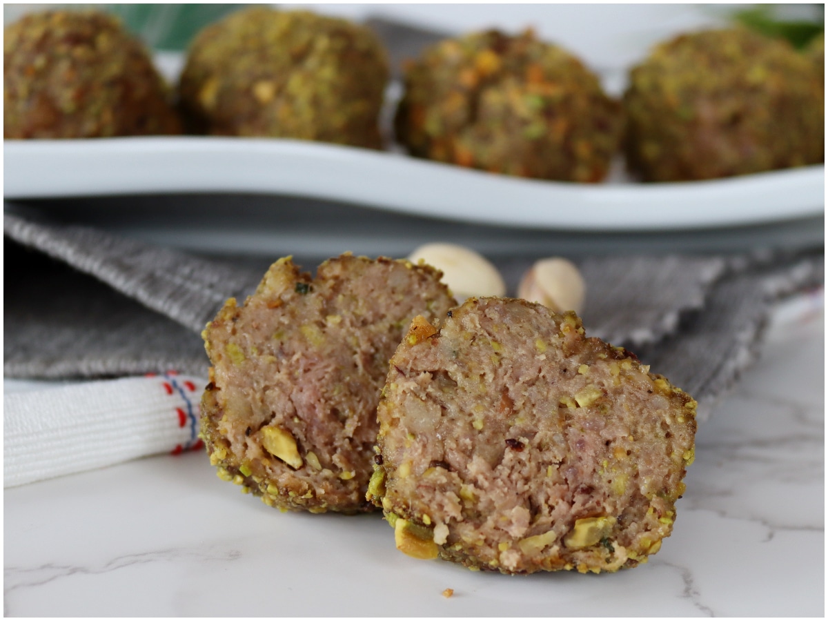 Le polpette al pistacchio sono una rivelazione.In realtà io ho scoperto che il pistacchio risulta particolarmente buono con la carne di maiale (anche con la salsiccia), ragion per cui per queste polpette ho usato macinato misto di manzo e maiale (ma voi, se volete spingervi un po' oltre, potete anche fare salsiccia e manzo, per dire). Facili da fare, sono delle normalissime polpette, solo che hanno un po' di granella di nocciole nell'impasto e un po' fuori, usata come una panatura. Ah, un'ultima cosa: io le ho cotte in forno con un filo d'olio, ma potete optare anche per la padella, se preferite. Detto questo vi lascio alla ricetta e ci leggiamo più tardi!