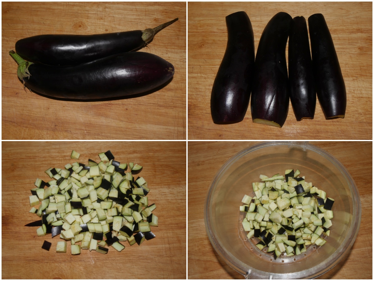 Innanzitutto lavate le melanzane, mondatele e tagliatele a cubetti, cercando di farli uniformi, quindi salatele e lasciate riposare per almeno 30 minuti.