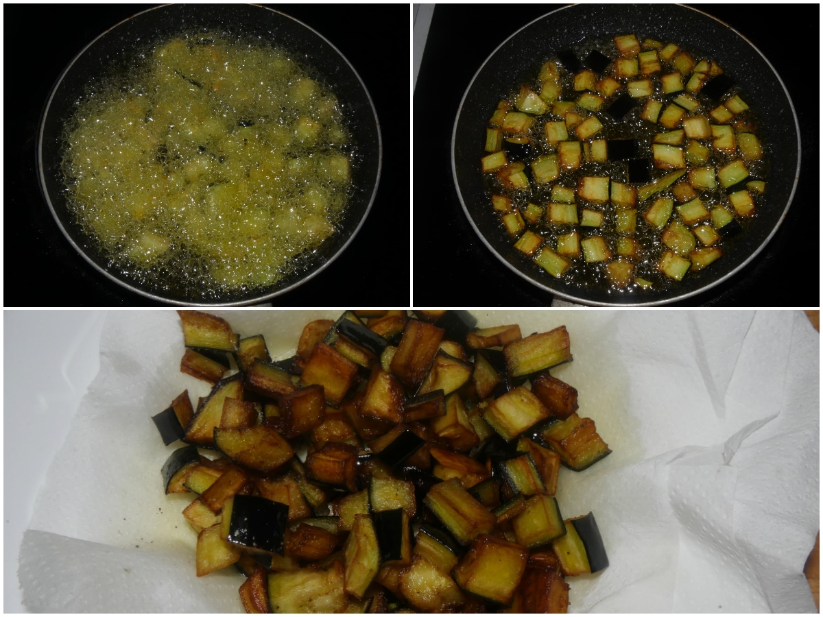 Riprendete le melanzane, strizzatele delicatamente, sciacquatele e tamponate con carta da cucina, quindi friggetele in olio abbondante, scolando poi su carta da cucina.
