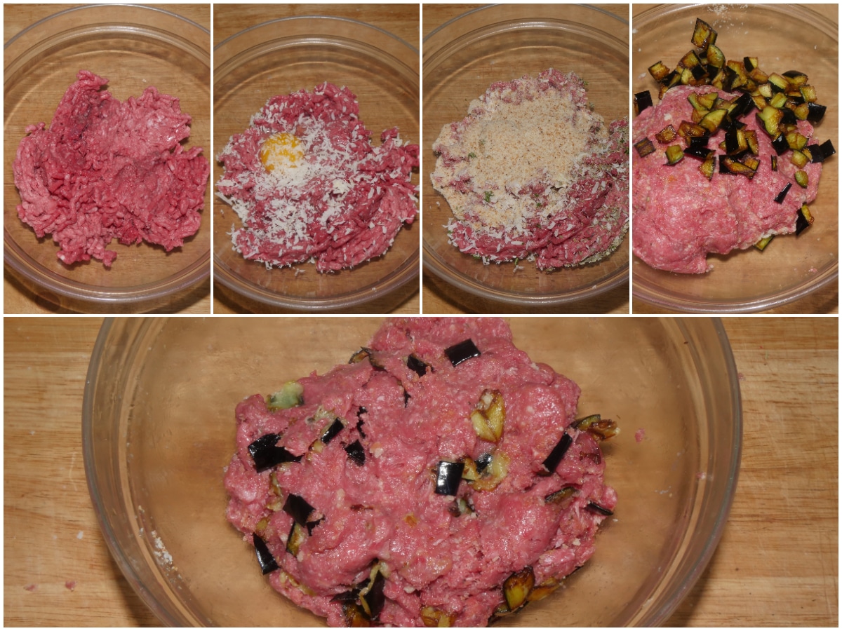 Nel frattempo preparate l'impasto per le polpette: mettete in una ciotola macinato, formaggio, pangrattato, uovo, sale e aromi e amalgamate bene, quindi aggiungete anche metà delle melanzane e mescolate delicatamente.