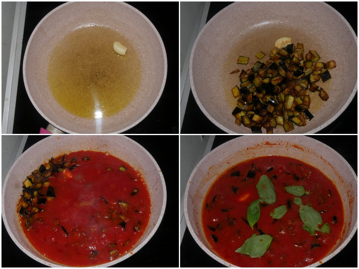 Mettete a fare il sugo: fate rosolare aglio e olio in una casseruola ampia, quindi unite melanzane, passata, basilico e sale e lasciate cuocere a fiamma bassa per almeno 15 minuti.