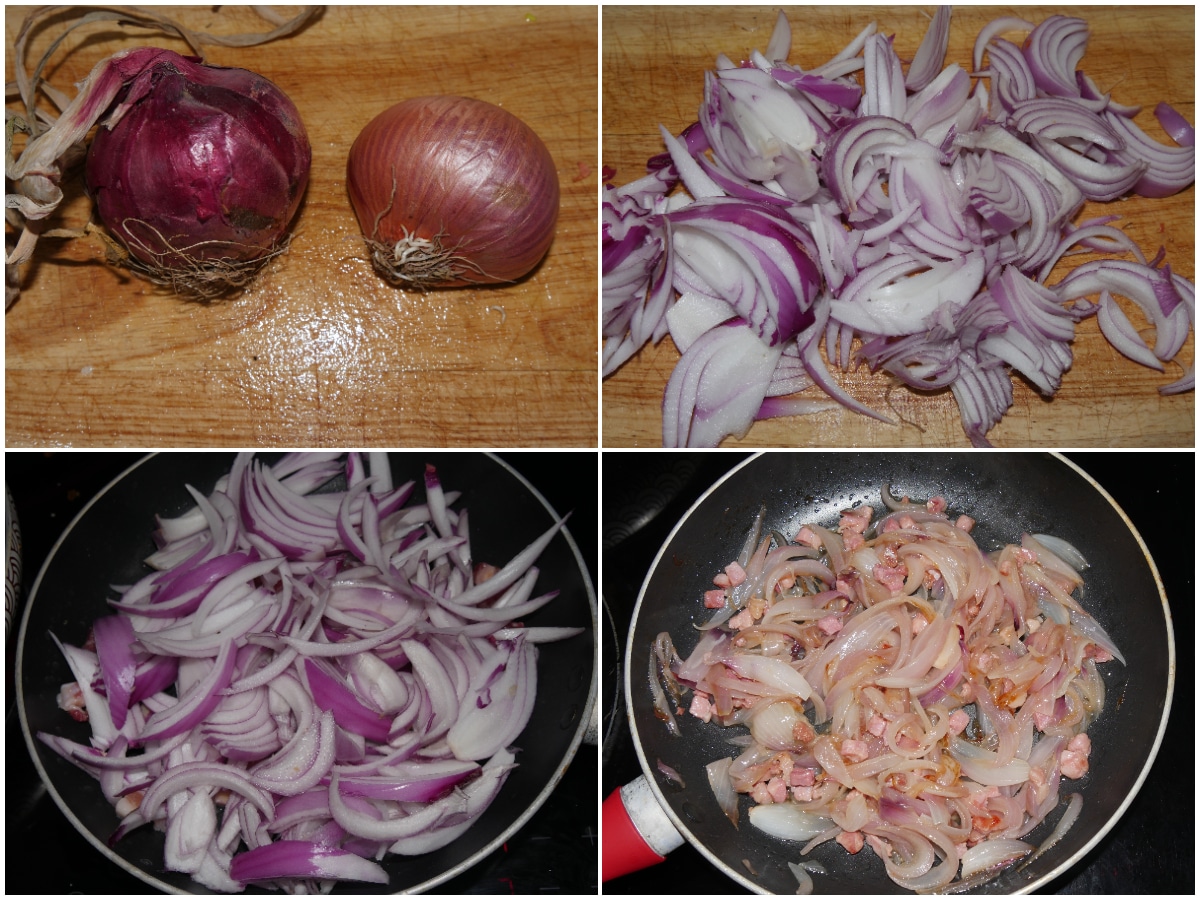 Innanzitutto mondate le cipolle, tagliatele a fettine sottili e stufatele in padella antiaderente con sale, pepe, olio di oliva e pancetta finché non saranno ben appassite, quindi lasciatele intiepidire.