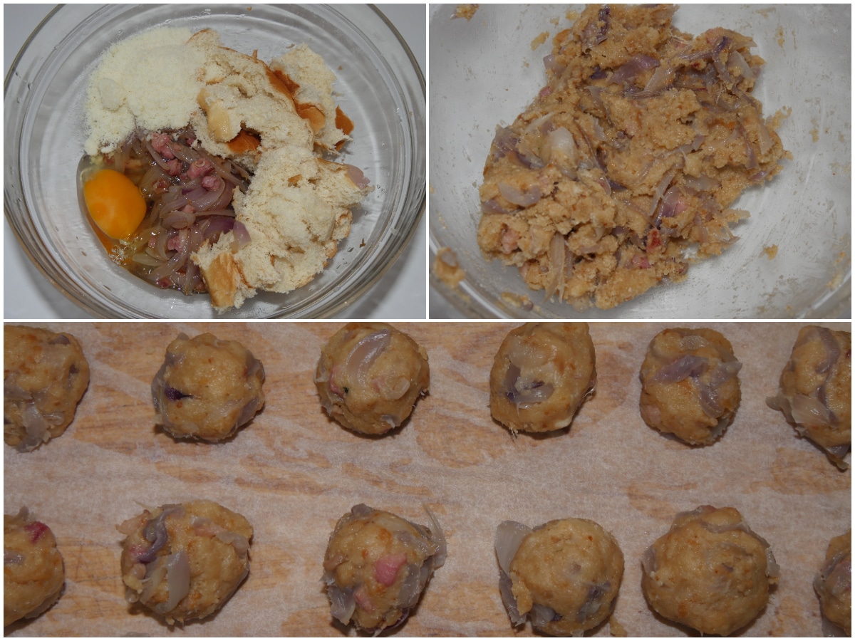 Unite in una ciotola pane spugnato e strizzato, pecorino, pangrattato, cipolle e uova e mescolate bene, fino ad ottenere un composto abbastanza compatto.