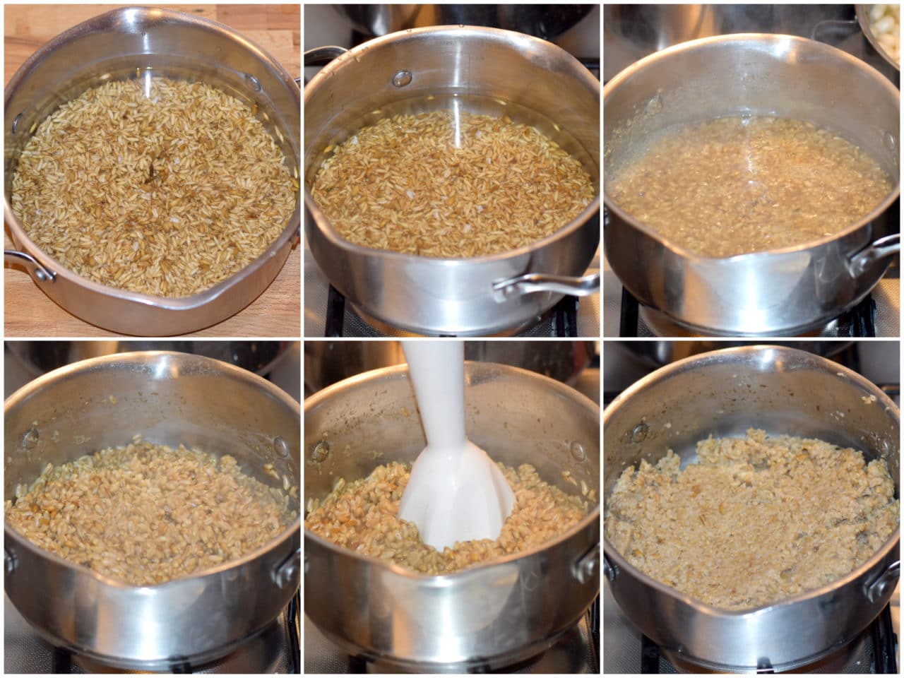 Mettete l'avena in una pentola con l'acqua (i 450 gr), coprite con il coperchio lasciando uno spiragli aperto e lessate a fiamma medio-bassa per circa 40-45 minuti, finché non avrà assorbito tutta l'acqua.
