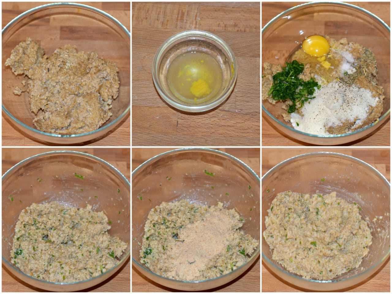 Dopo aver frullato l'avena mettetela in una ciotola con uovo, limone, sale, pepe, pecorino e origano e prezzemolo tritati.