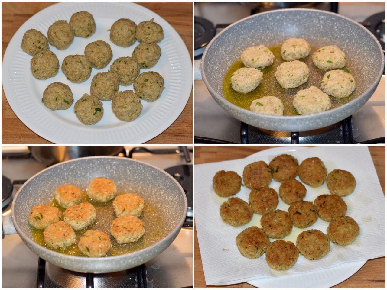Formate le polpettine, schiacciatele leggermente e cuocetele in una padella antiaderente con dell'olio già caldo, girandole per far dorare entrambi i lati.