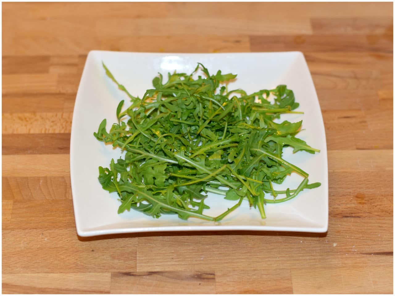 Mondatel la rucola, lavatela, scolatela bene e usatela per comporre un letto sul piatto da portata.