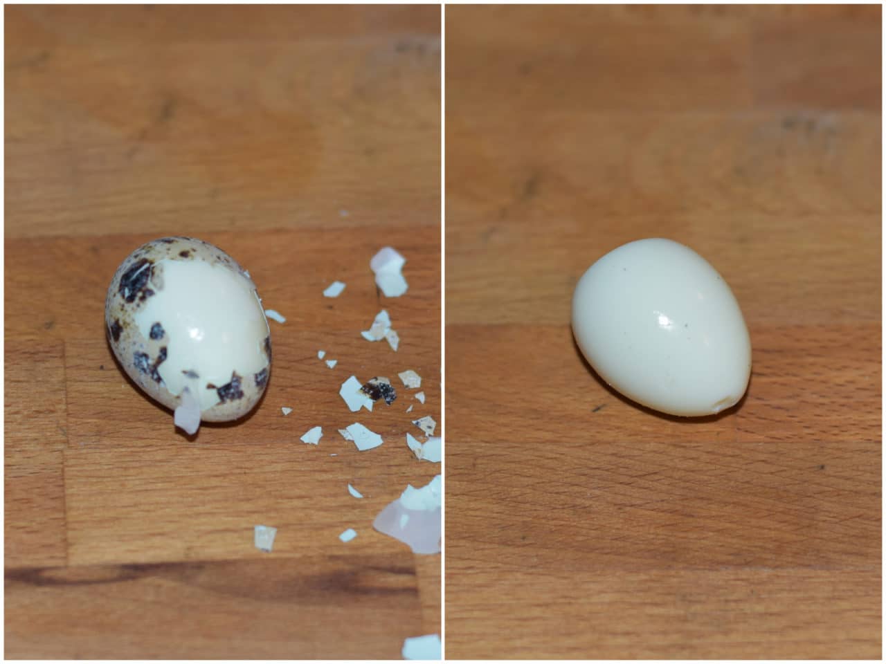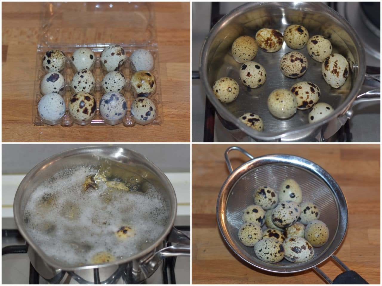 Innanzitutto mettete a cuocere le uova di quaglia: mettetele in un pentolino, copritele con acqua fredda e contate 4 minuti a partire dall'ebollizione, quindi scolatele, lasciatele raffreddare sotto acqua corrente e sgusciatele.