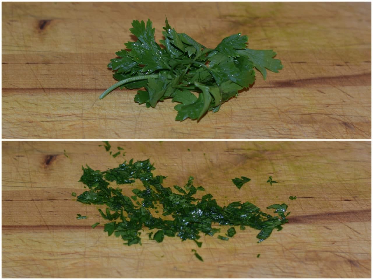 Preparate gli altri ingredienti: tritate il prezzemolo e strizzate il pane.