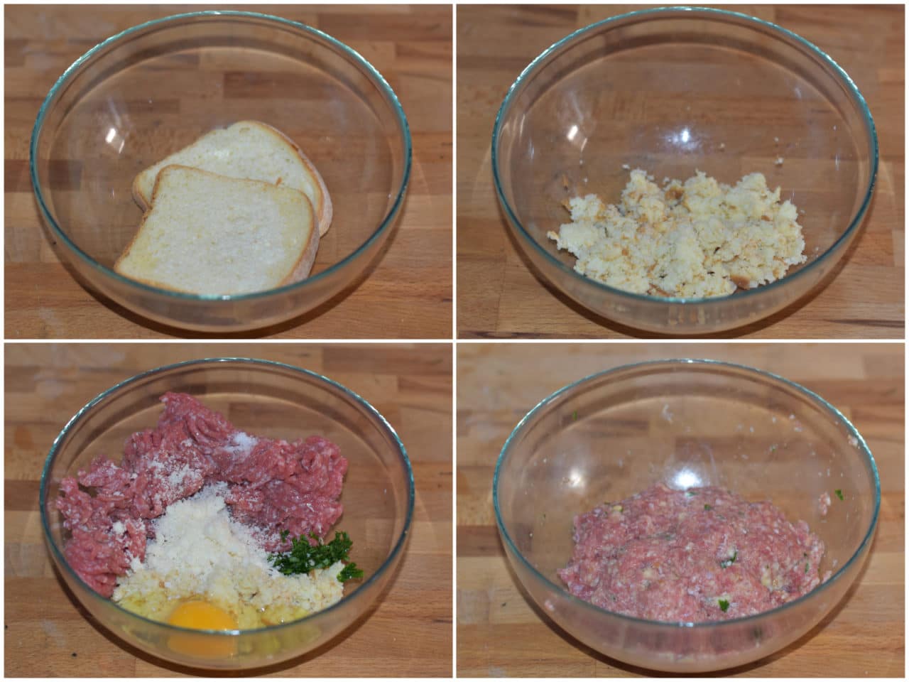 Preparate quindi l'impasto per le polpette: unite in una ciotola macinato, pane, uovo, parmigiano e un pizzico di sale e amalgamate.