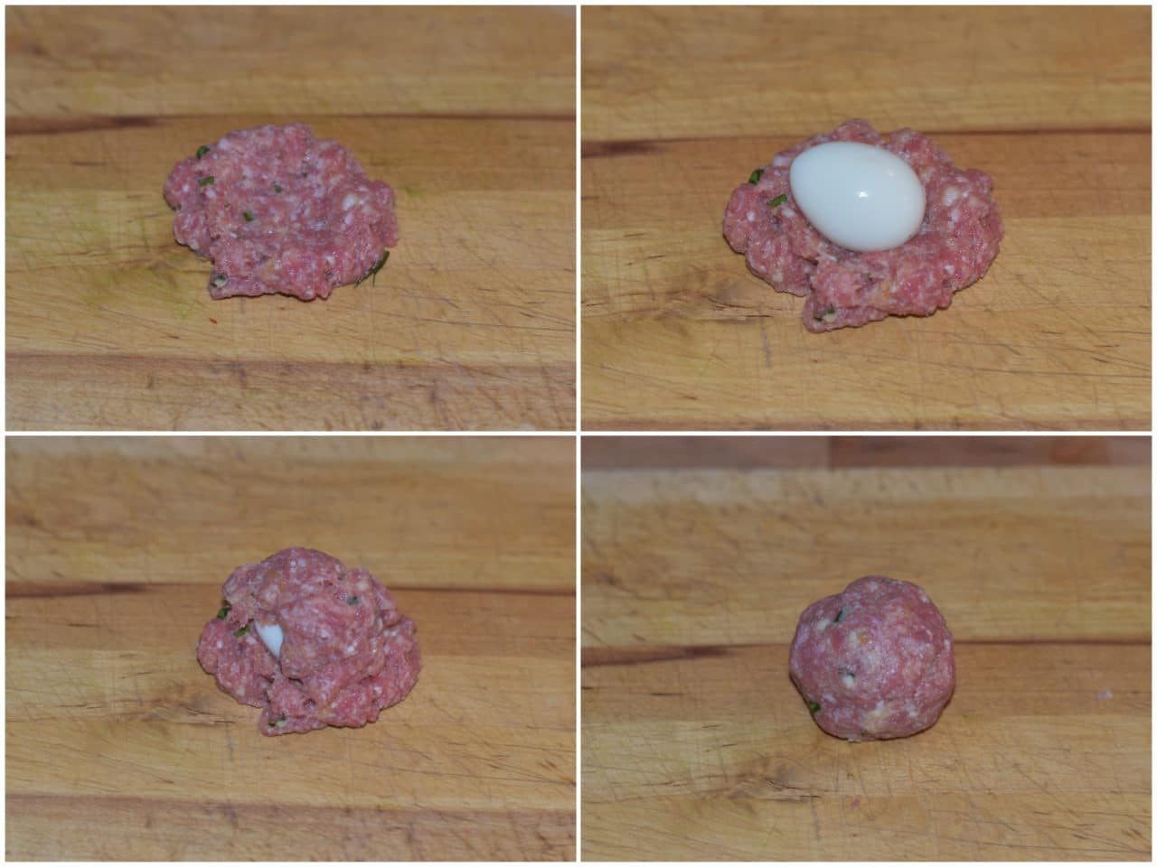 Prendete 1 cucchiaio di composto per volta e appiattitelo tra le mani; posizionate al centro 1 uovo di quaglia e richiudete il composto sull'uovo, creando la polpetta, continuando nello stesso modo fino ad esaurire gli ingredienti.