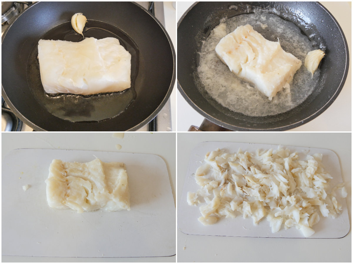 Sciacquate bene il baccalà (già dissalato) sotto acqua corrente, quindi mettetelo in una casseruola con aglio e olio, coprite con il coperchio e lasciate cuocere per circa 10 minuti, girandolo verso metà cottura e aggiungendo acqua se necessario.