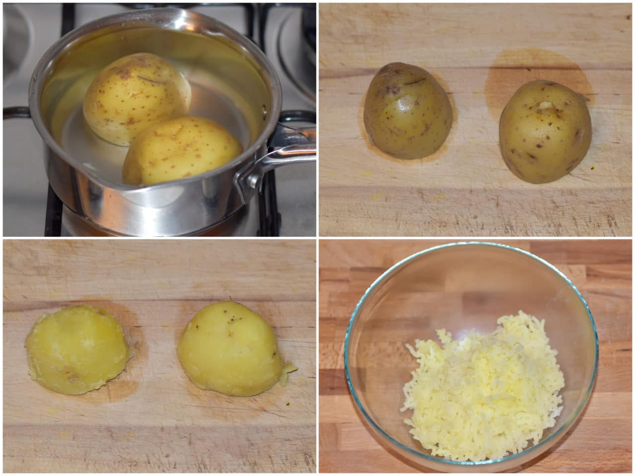 Innanzitutto lavate bene le patate, mettetele in una casseruola con abbondante acqua fredda e cuocete a fiamma alta per circa 30 minuti dall'ebollizione: quando saranno ben morbide scolatele, pelatele e schiacciatele finché sono ancora calde.